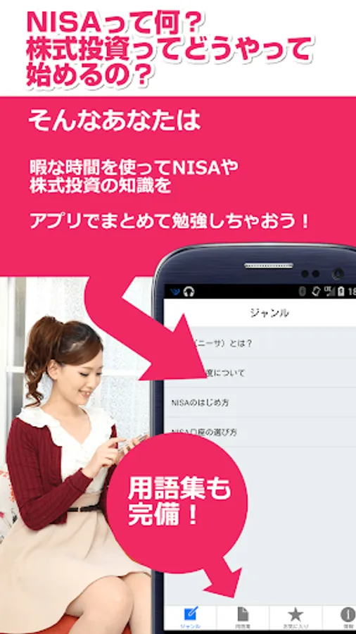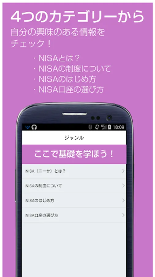 当アプリ「NISAのはじめ方」ではNISAに関する制度の解説や実際にNISAを始める為に必要なもの、難しい株式投資用語の解説などを分かりやすくカテゴリー別に分けて解説している株初心者にオススメのガイドアプリです。