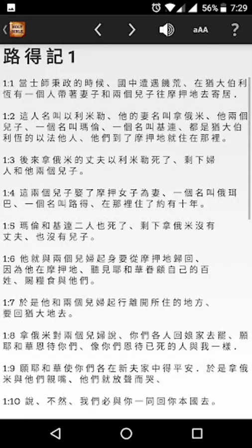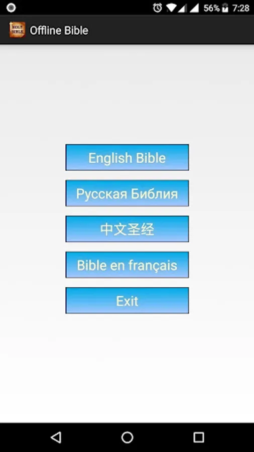 - If you want to play audio of displayed chapter in English, French and Chinese Bible (Russian Text To Speech is not supported), use Audio button available in the top right corner of Action Bar.
