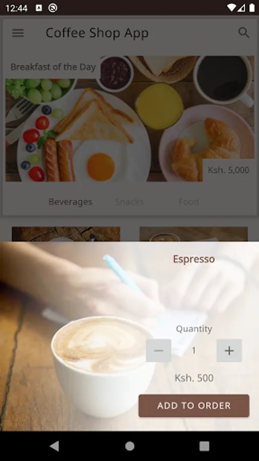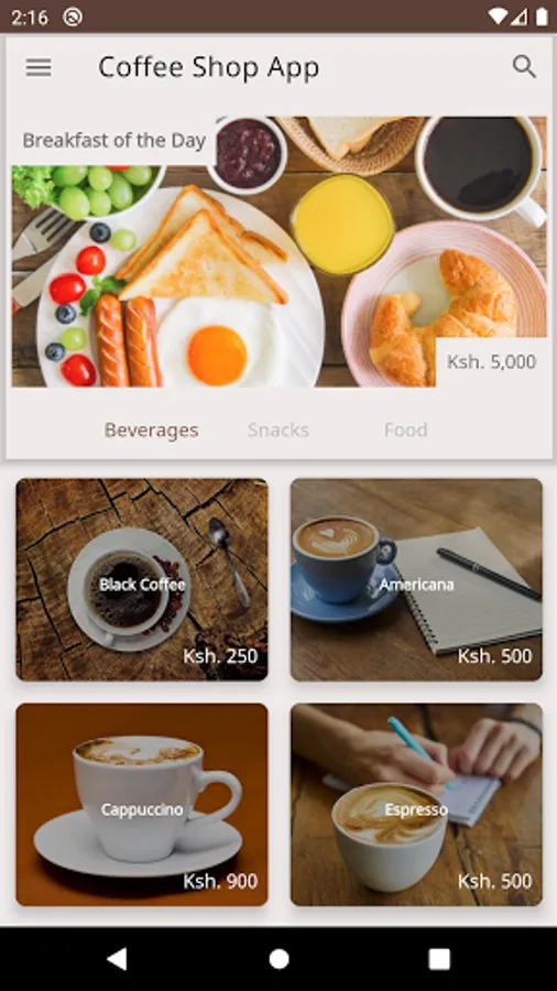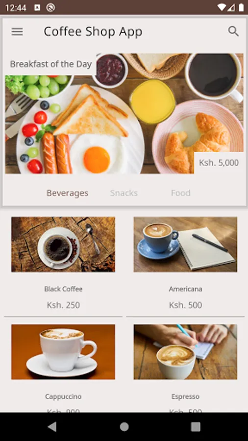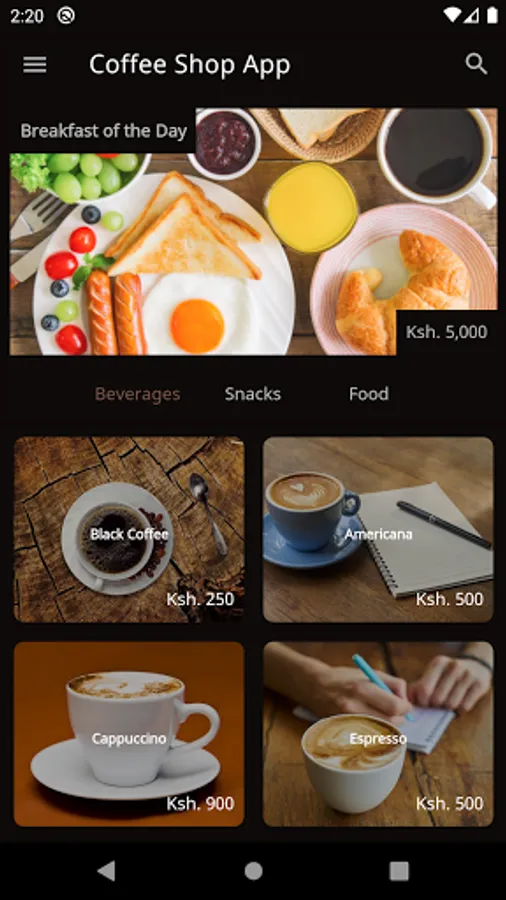 This is a coffee shop application that I built to demonstrate my design and development skills in Android. The design used for this demo can be extrapolated for any store application especially stores that sell visually appealing products like food, clothes, vehicles etc.