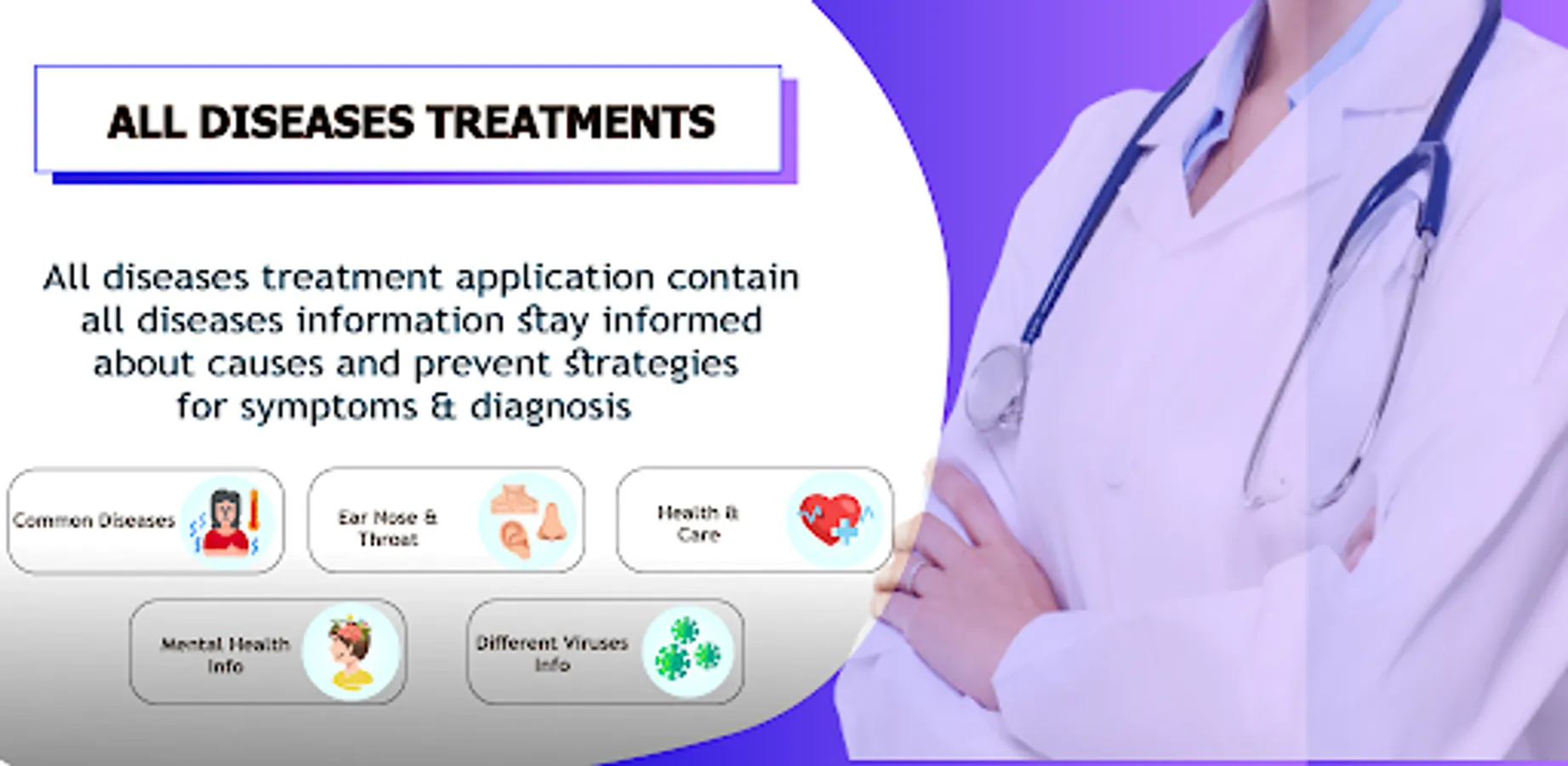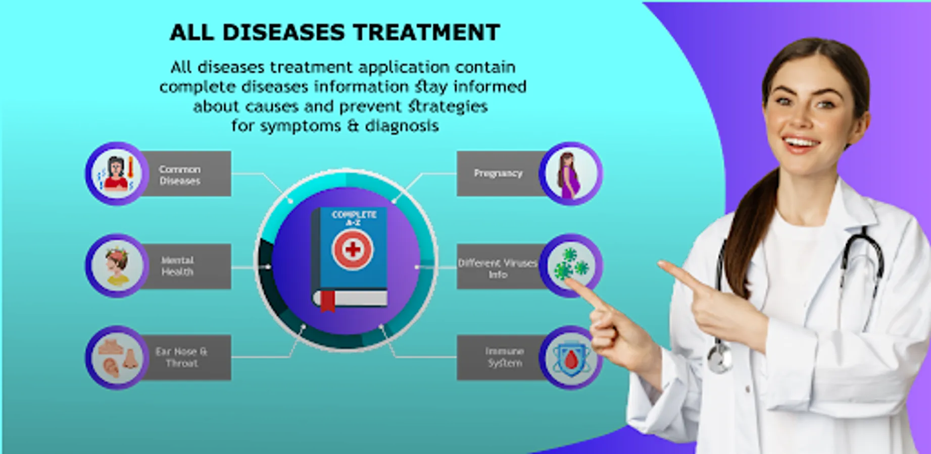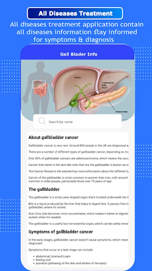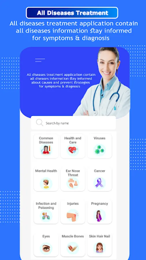 All Diseases Treatments included completed details of any diseases symptoms and treatment information complete solution to read all diseases treatments through this app. All major categories relevant to diseases including common diseases, health and care, viruses, mental health, ear, nose and throat relevant diseases, cancer, infection and poisoning, injuries, pregnancy relevant complications, eyes relevant and almost every part of body relevant diseases are added. All common diseases including allergies, cold and flu, diarrhea, headaches, hepatitis, and their types are included. Symptom Check Select symptoms, learn about possible illnesses or problems, and find treatment and care options. Conditions Find medical information about conditions that interest you and learn about causes, treatment and associated symptoms.