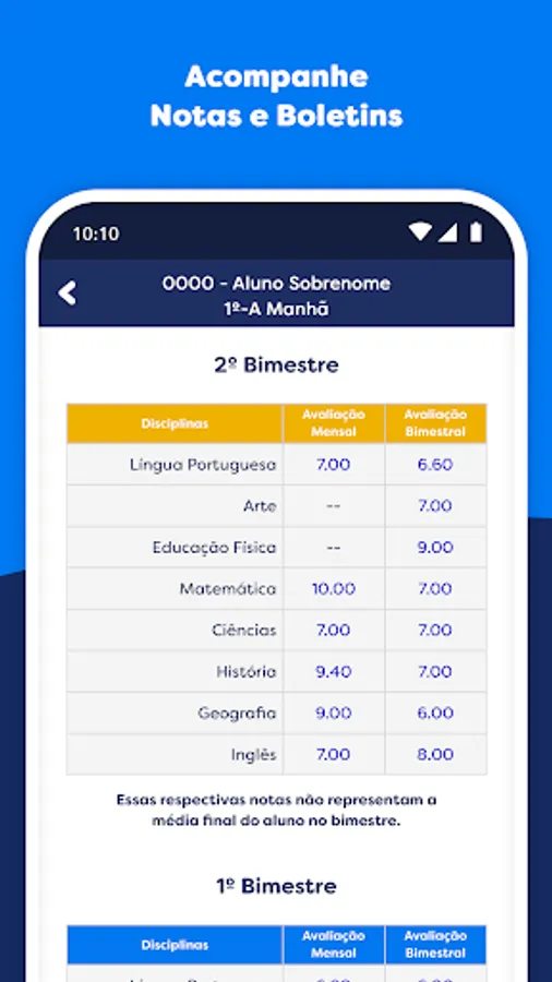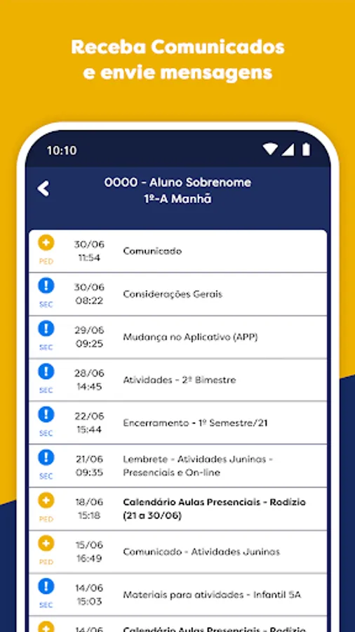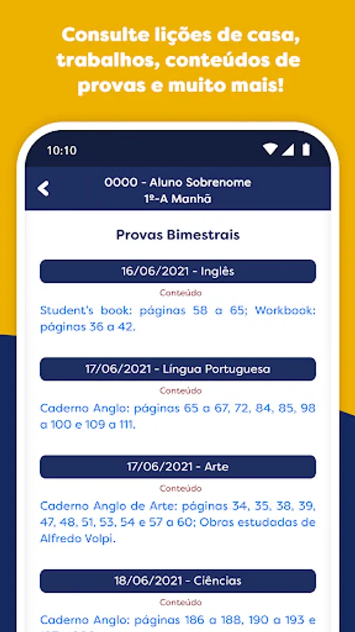 - Allows consultation of daily occurrences, class schedules, notes and bulletins, homework and assignments, exam calendar, etc.