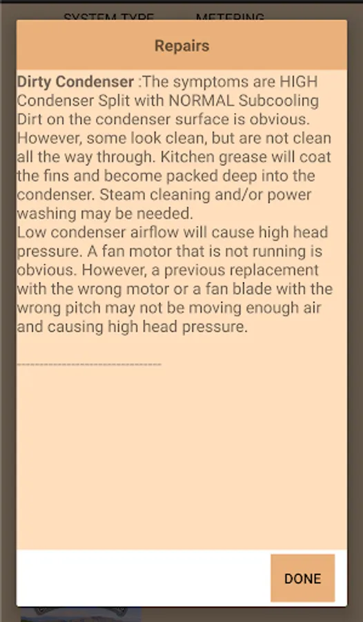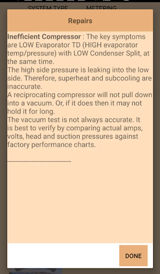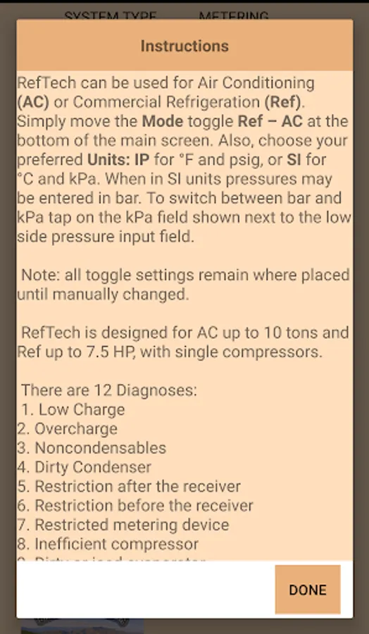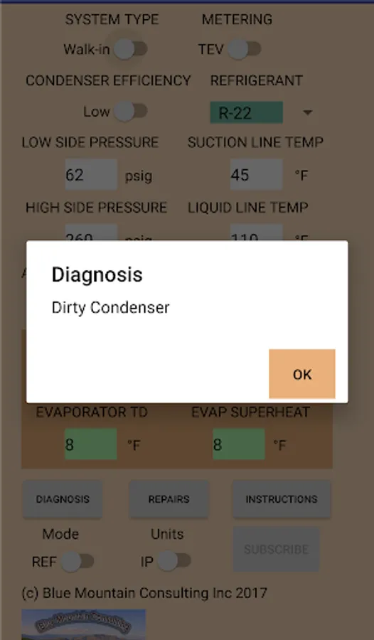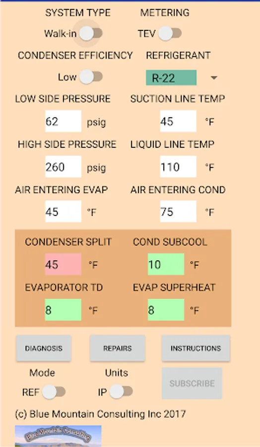 Disclaimer: This app is designed as a diagnostic aid to supplement observations of refrigeration system operation. It in no way warrants or guarantees the diagnosis is absolutely correct. The user accepts all responsibility as to the accuracy and validity of the repairs the user employs.