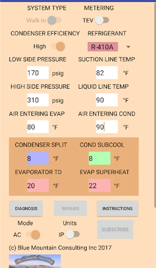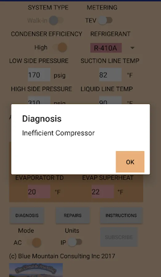 This app is designed for Commercial Refrigeration equipment up to 7.5 HP and Air Conditioning equipment up to 10 tons with a single compressor. It will help confirm those difficult diagnoses on equipment that is not maintaining temperature, but is running without an obvious reason for its problems. Please note that this app is a subscription app and a current subscription is required to access the functionality. The price for a subscription is $9.99 a year with a free initial 2 week trial, and will allow access to the latest app updates including the newest refrigerants. Further information can be found in the instructions which can be opened after downloading and installing the app.
