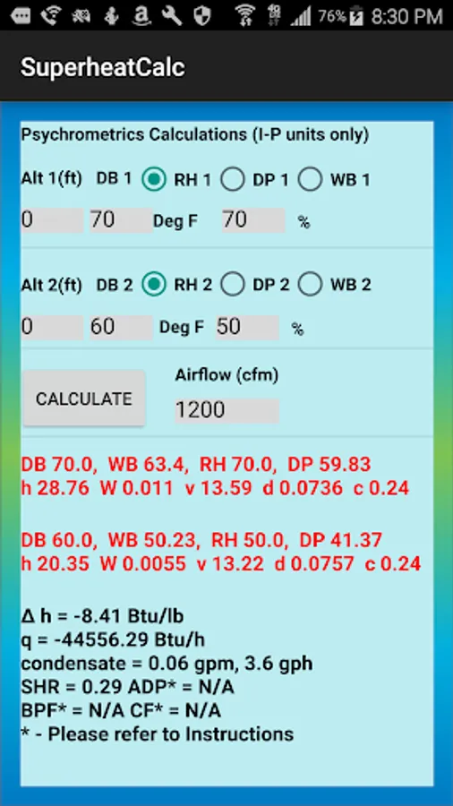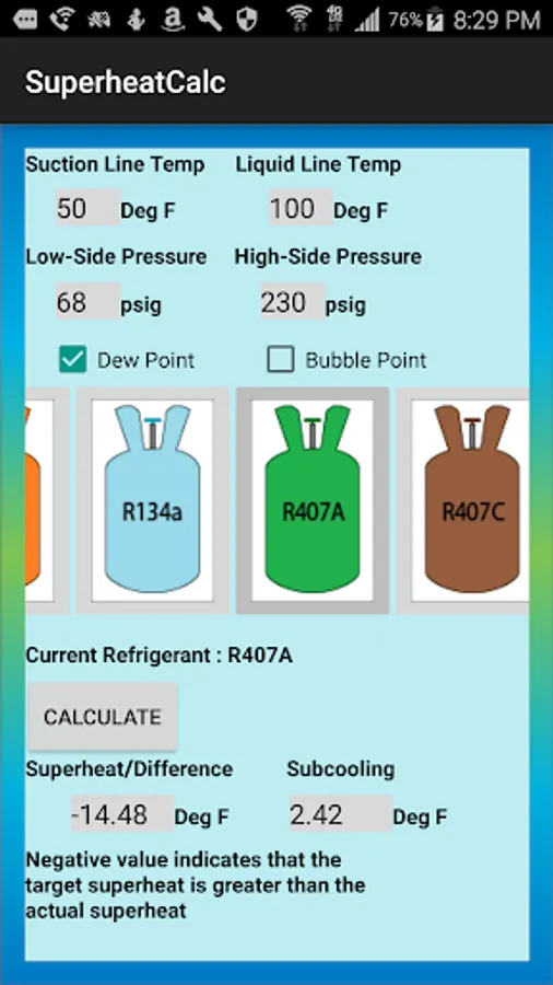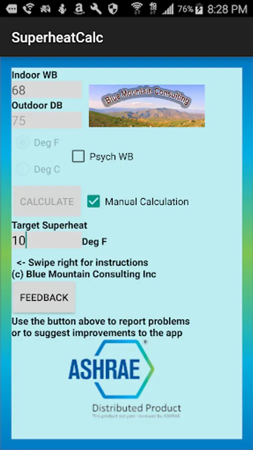 Calculator app for use in HVACR diagnostics and service. Can calculate target superheat for fixed orifice expansion devices, superheat and subcooling for 26 refrigerants, airflow calculations and psychrometric calculations to aid with field service of HVACR equipment. Detailed instructions on using the app may be viewed by swiping right after opening the app.