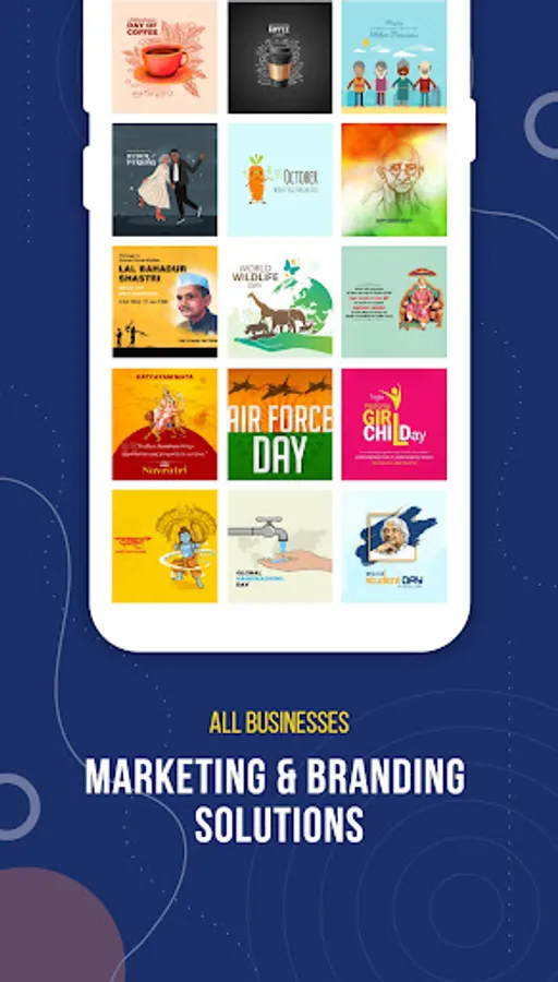 Using this app you get all types of Festivals & Day's Posters, Special days banners, Good Morning Banners, Good Night Banners, Business Marketing Poster, Motivational Banners, National Days Banners, Motivational Banners, Susanskritm Banners, Geeta Bodh Posters, Congratulation, Wishes Message, Rest In Peace, Grand Opening etc.