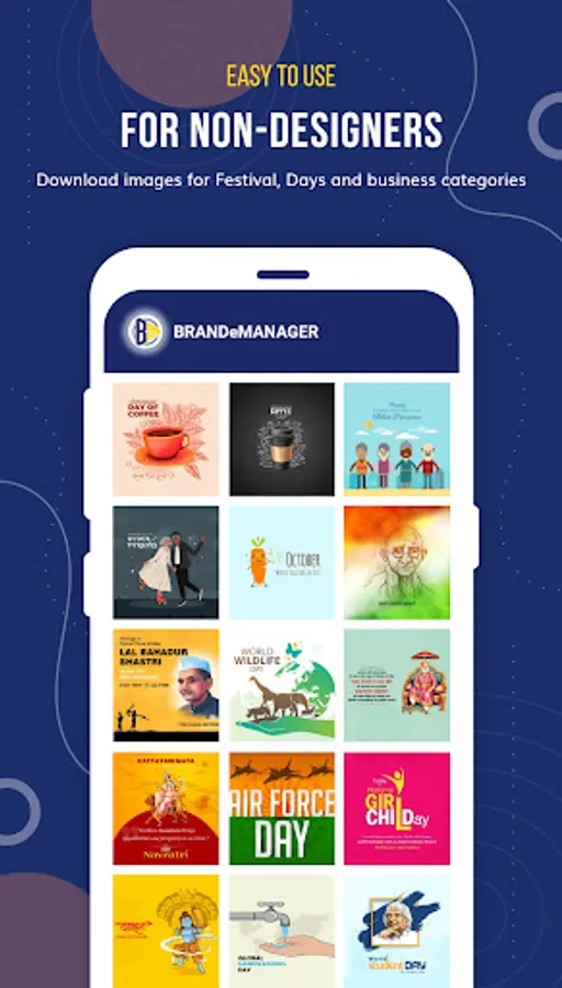 Brand eManager is No.1 Indian Business Branding app for grow your business. This app helps you to make poster of Festivals & Day Poster, Business Marketing Poster, Political Poster, Trending Post, Birthday Post, Daily Post (Like, Motivational, Business Ethics, Leader Quotes, Good Morning, Good Night, Sport, Devotional, Rest in Peace, and Wishes Post and many more daily post we're providing all Languages.