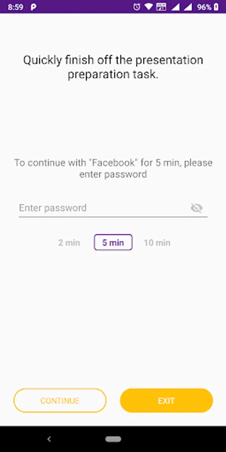 • Limit app usage and stay focused by restricting yourself to use the locked app only for few minutes.