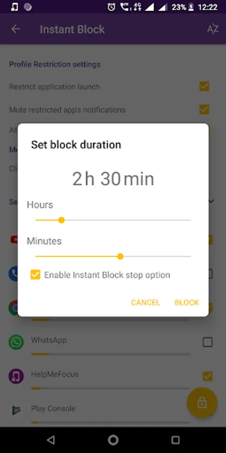 • Block the app blocker - Block HelpMeFocus application by choosing it in the application list to be blocked to enforce self-control and avoid profile/settings modifications.