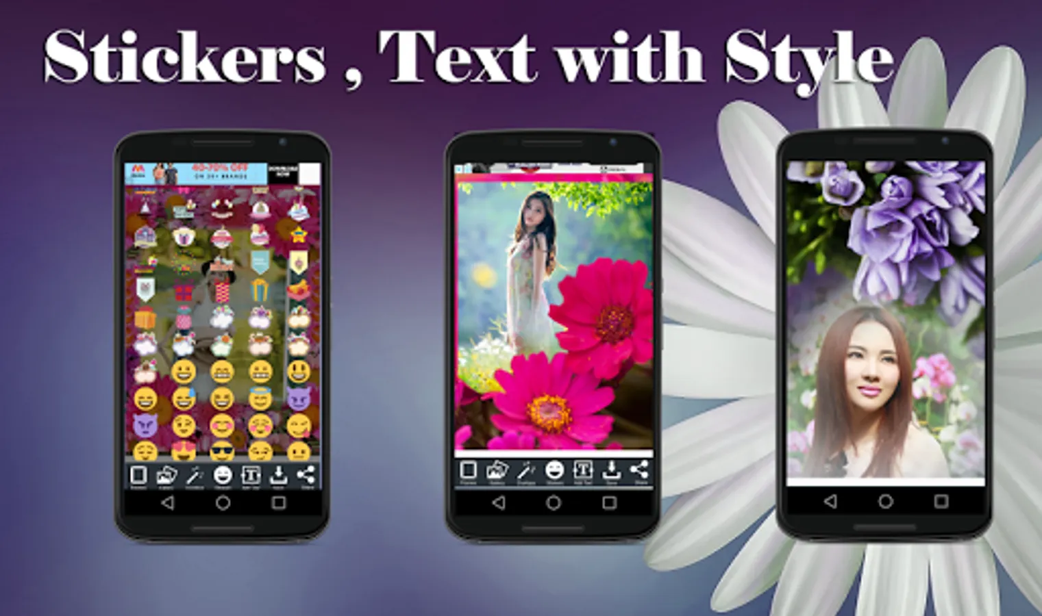You can easily apply different color, photo effects or fonts to your pictures with Flower Photo Frames. Select any photo / picture from gallery or take a picture using camera and embed the photo of your choice into beautiful Flower photo frames. Filters , Stickers and text.