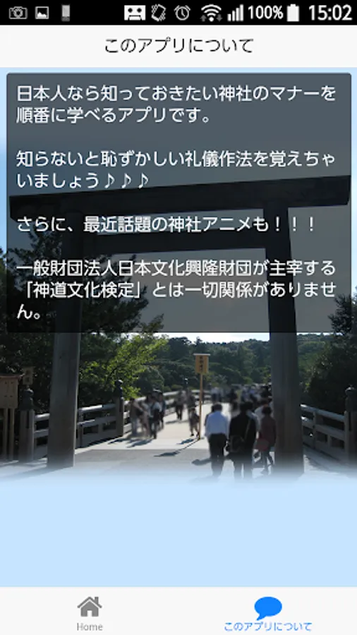 日本人なら知っておきたい神社のマナーを順番に学べるアプリです。