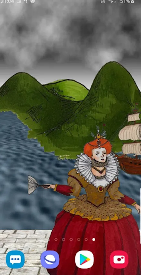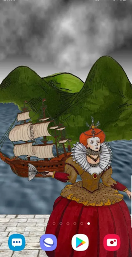 This is a live wallpaper of Queen Elizabeth 1st waving her fleet on, the artist is Katie Garwood, i have animated it with opengl and glsl shader code. Because the sea and cloud are drawn on the fly by the program it may run a little slow on older phones and cause slight delay with moving across your screens, there is no delay once you open an app. I know as i have had it loaded on my phone for some weeks while tweaking the waves and cloud effect.