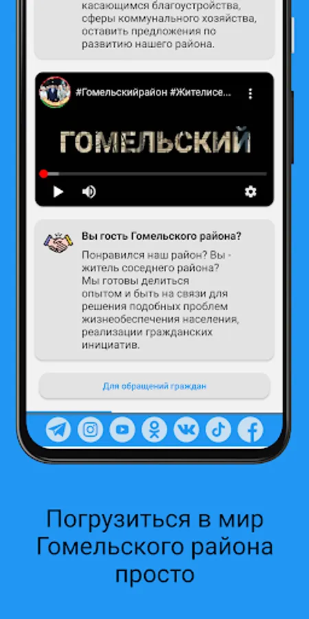 Mobile application "Gomel region" is a convenient and quick access to up-to-date information about the Gomel region. It combines the most popular services and helps organize interactive interaction between users and the local environment - government organizations, educational and healthcare institutions, cultural and leisure facilities - through SMM algorithms developed by a competent team of specialists. You no longer have to search for information about the Gomel region all over the Internet.