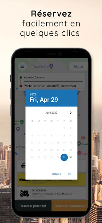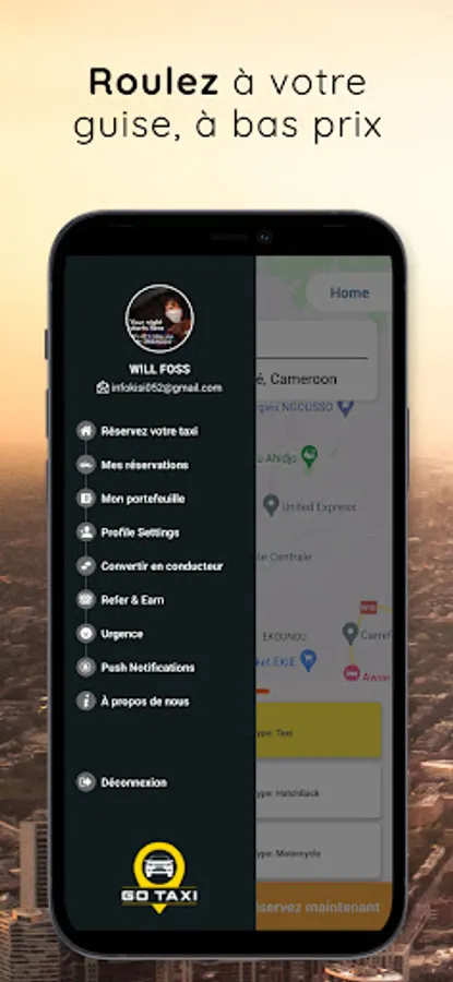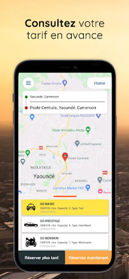 Book easily in a few clicks your driver for all your trips in Cameroon or Africa. The Go Taxi application allows you to order your driver by reservation or immediately.