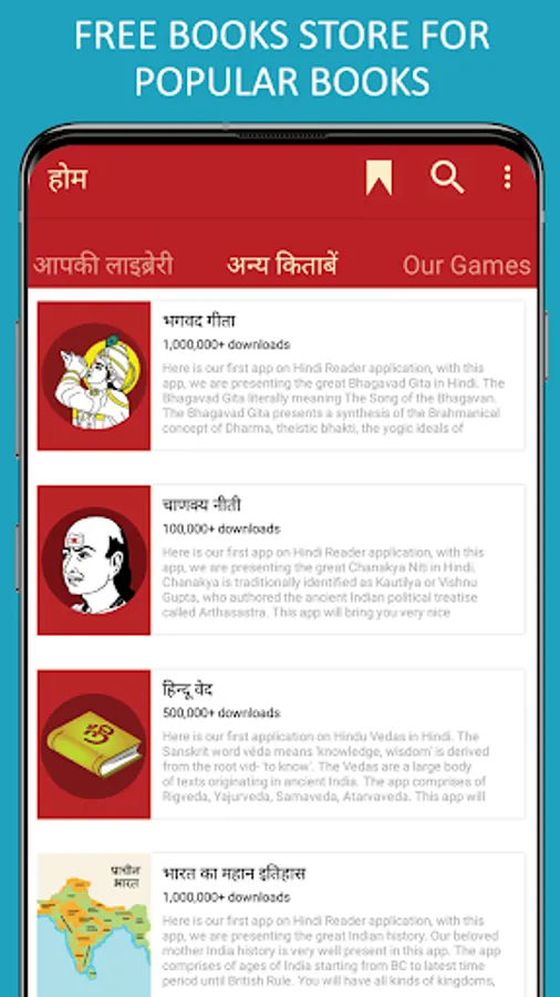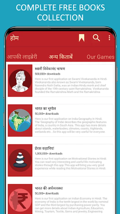 The app is a best android reader application for Hindi, you can see the Hindi texts appearing crystal clear with your android mobiles. Below are the features of this app,