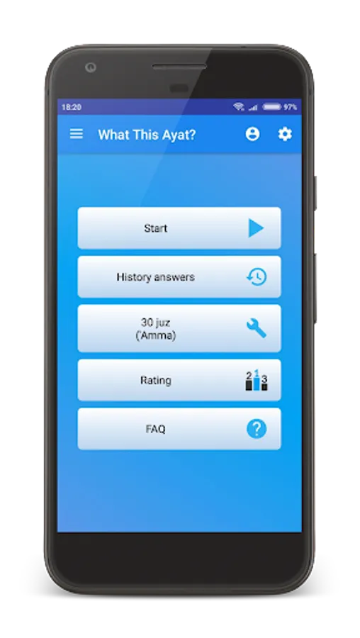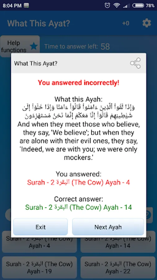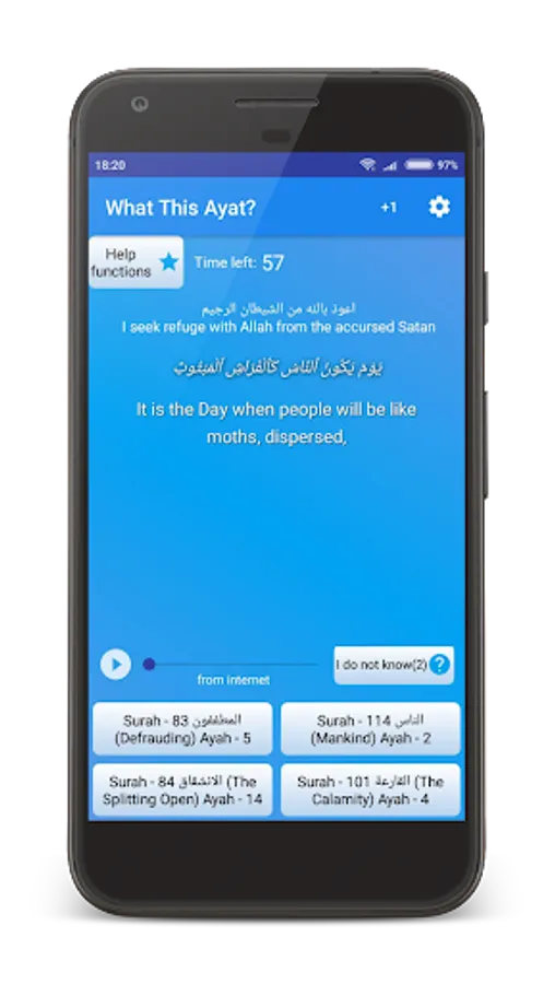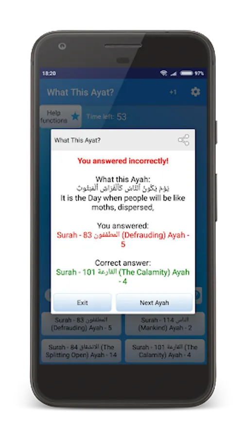 You given a random Ayat from the Quran, and 4 possible answers and you have to guess "What this Ayat?", also have the possibility listen the Ayat (online only).