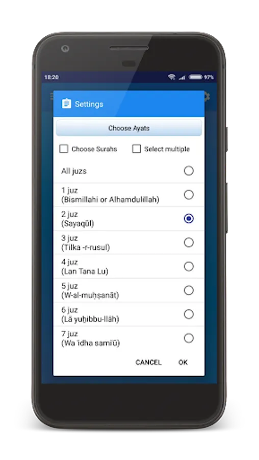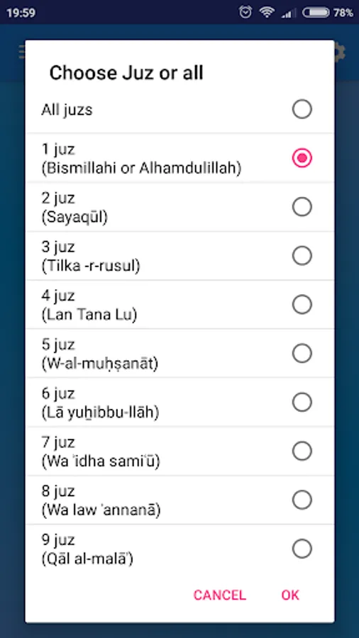 There is a possibility of choosing Juz or Surah or the whole Quran.