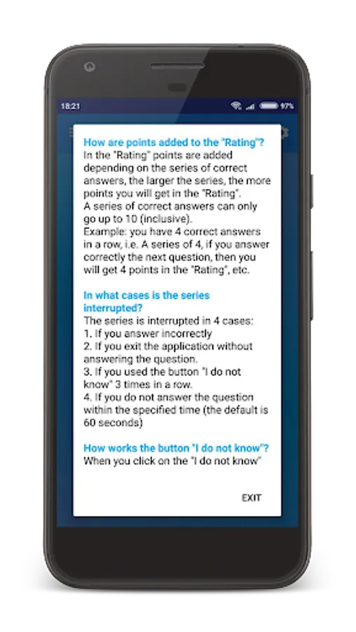 In the "Rating" points are added depending on the series of correct answers, for example, 1 time you answer correctly, ie you have a series of one and if you answer the next question correctly, in the "Rating" you will add one points and so on. The maximum number of series 10 (inclusive).