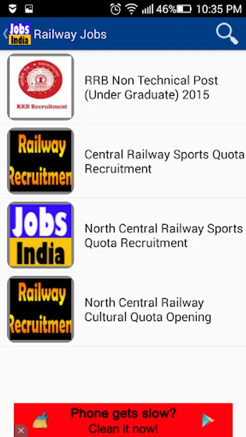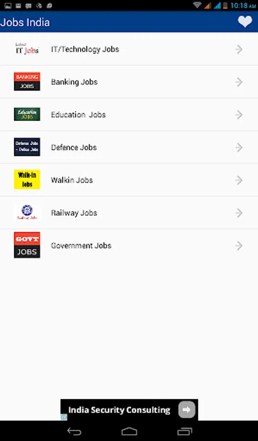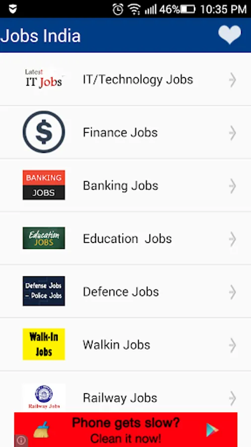 The App " Jobs India " provides information regarding various job opening in India .It has an easy to use interface with jobs listed under top categories .
