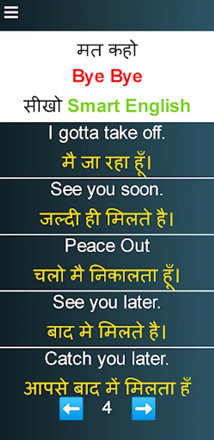दोस्तों यदि आपको अंग्रेजी बेहतर बनानी है और आप रोज़ बोली जानी वाली इंग्लिश के सेन्टेन्सेस सीखना चाहते है तो इस ऍप को जरूर इस्तेमाल करे। यह ऐप आपकी अंग्रेजी सुधारने मे मदत करेगा हिंदी भाषा का इस्तेमाल करके।