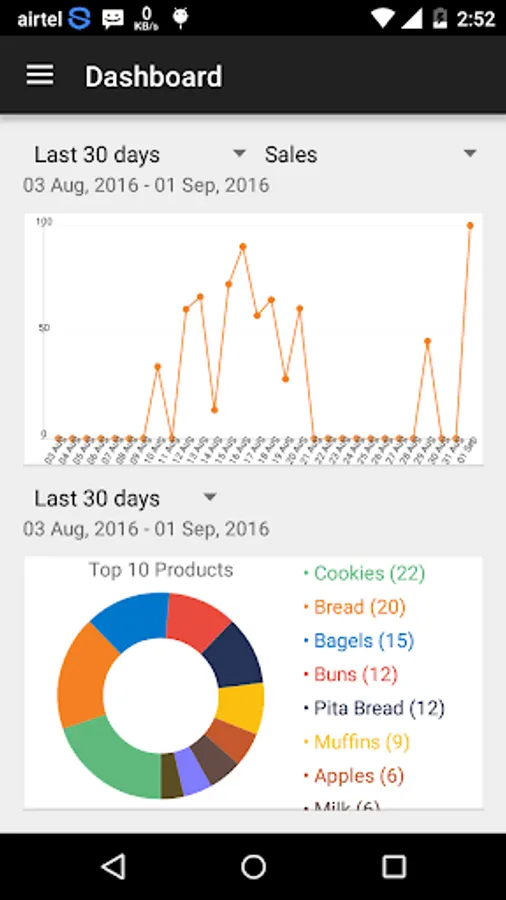* Pie chart of top 10 selling products with name and quantity.