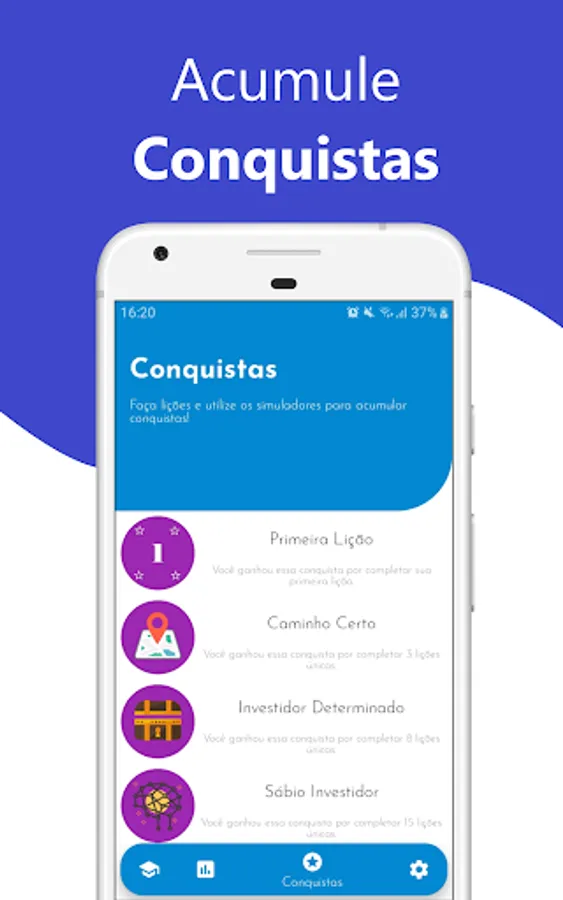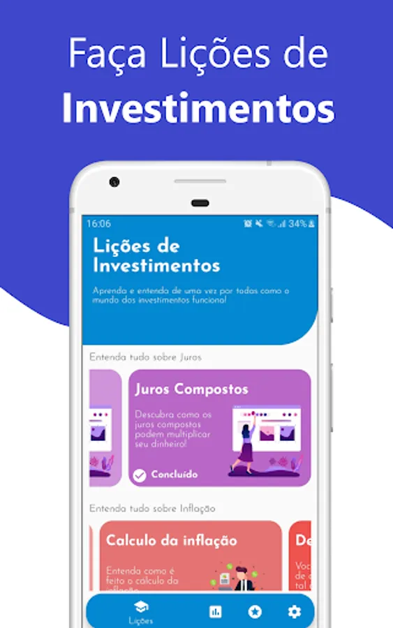 Knowing this need, the App now has short and objective lessons on the terms most used in the daily life of the investor, as well as lessons on how each investment works in practice, so you can obtain basic financial education in an easy and objective way