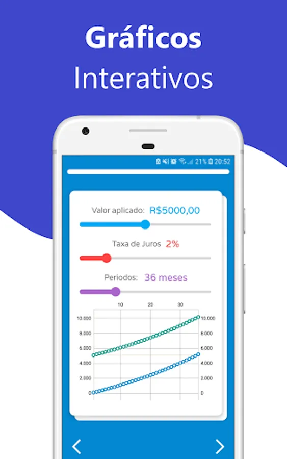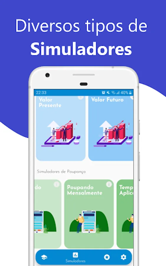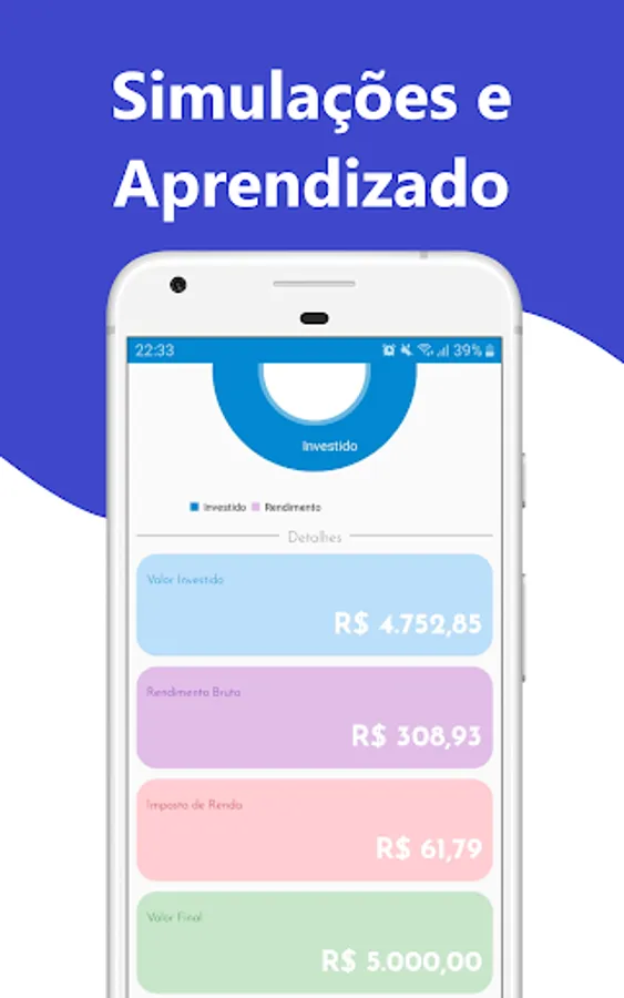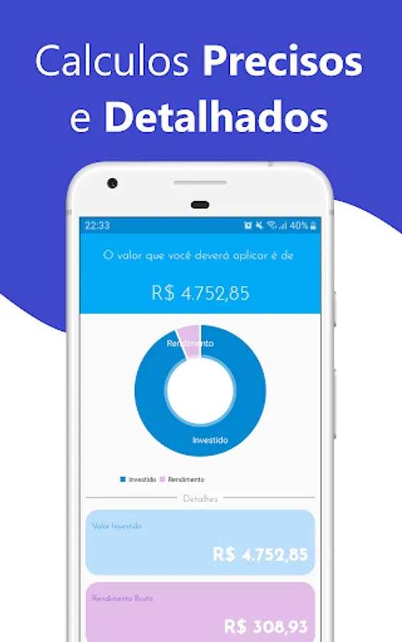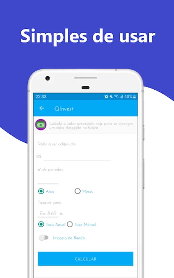 The app's goal is to make it easier to calculate the most used investments, with the intention of helping to understand how the evolution of investments works. The app also features functions on specific investments such as savings, simple interest and compound interest for example.