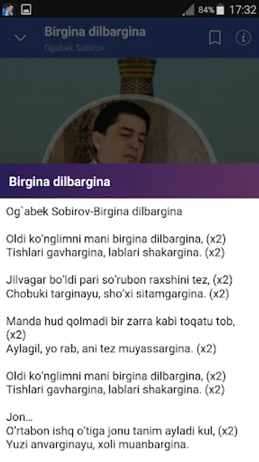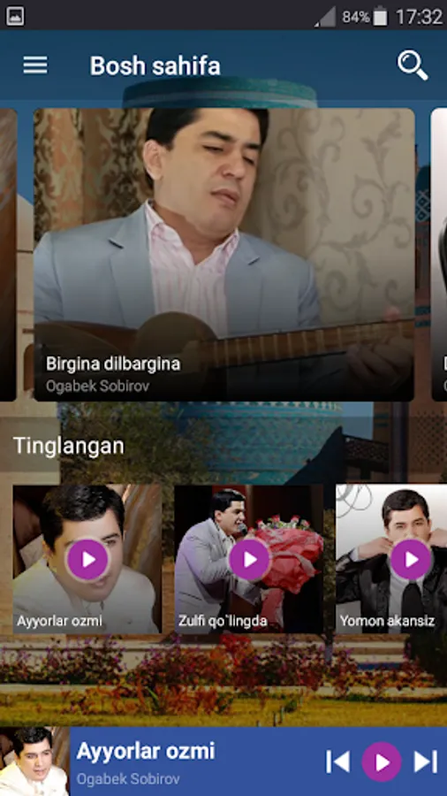 O'zining diltortar qo'shiqlari bilan xalqimiz yuragidan joy olib kelayotgan, Maftunkor ovoz sohibi, Xorazm bulbuli e'tirofiga sazovor bo'lgan honanda, O'zbekistonda hizmat ko'rsatgan artist Ogabek Sobirovning shaxsiy android ilovasi.