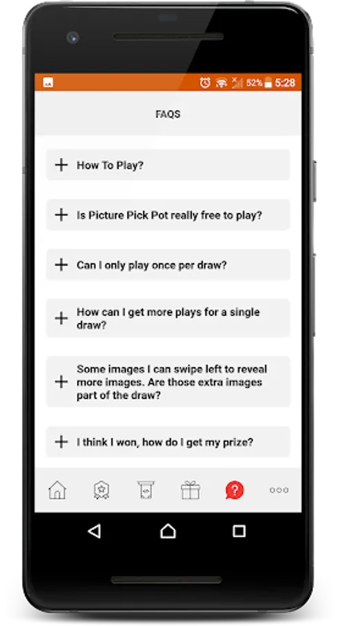Once on the home screen you’ll find 60 images. Scroll through the images and tap on your favorites to select them and fill out your selection circles at the top of the screen. All images you see are potential images that will be drawn. Fill in ALL the circles of the selection section with a mix of STANDARD images and one SPECIAL image selection. Images are divided up into two pools- 52 “Standard Images” and 8 “Special Images”. Find all the game information (grand prize, draw date & time) at the top of the home screen. After the clock has reached zero head over to the results screen and watch all the different images be eliminated. The last 5 images left are the winning images. If you’ve matched any combination you win a prize! Match them all to take home the grand prize!