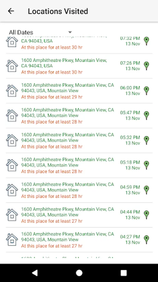- End of day you can see the locations that you have visited along with the duration you stayed there.