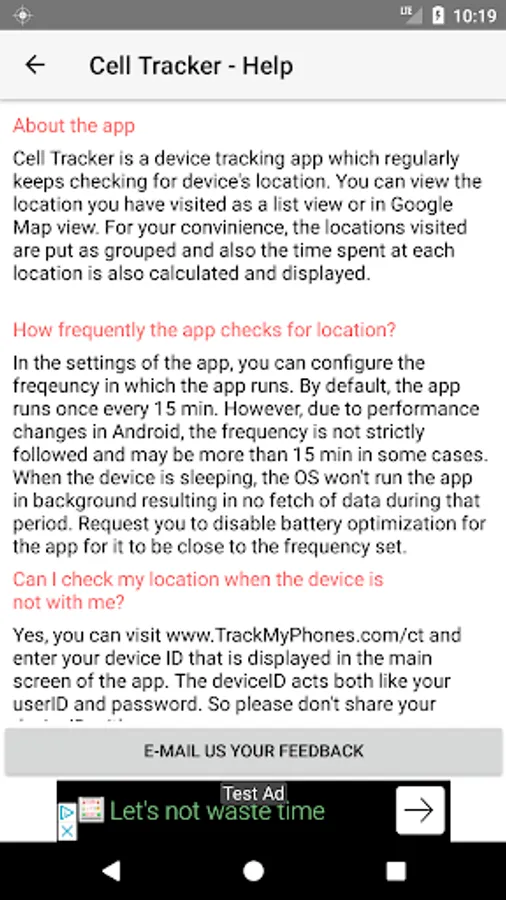Keep track of your or your dependents mobile when its not with you. Can also be used to track your vehicles location and route. Track all the locations you have visited in the last few days with your Android phone. The application collects location info once every 15 min through GPRS/Wi-Fi and hence the impact on battery is minimal.