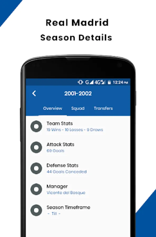 - Each Season's overview is composed of several statistics (defensive, attacking, and club overall statistics), Real Madrid's season top scorer, and the season duration.