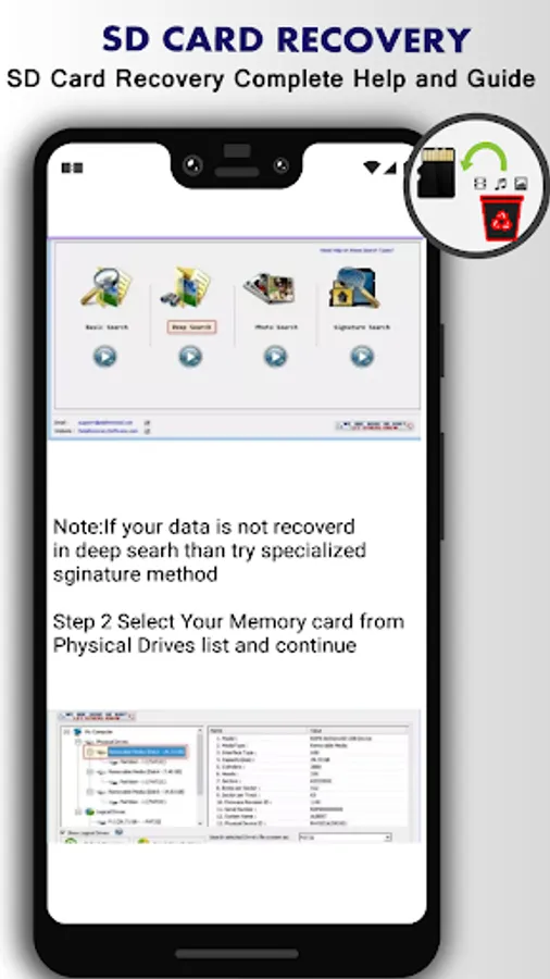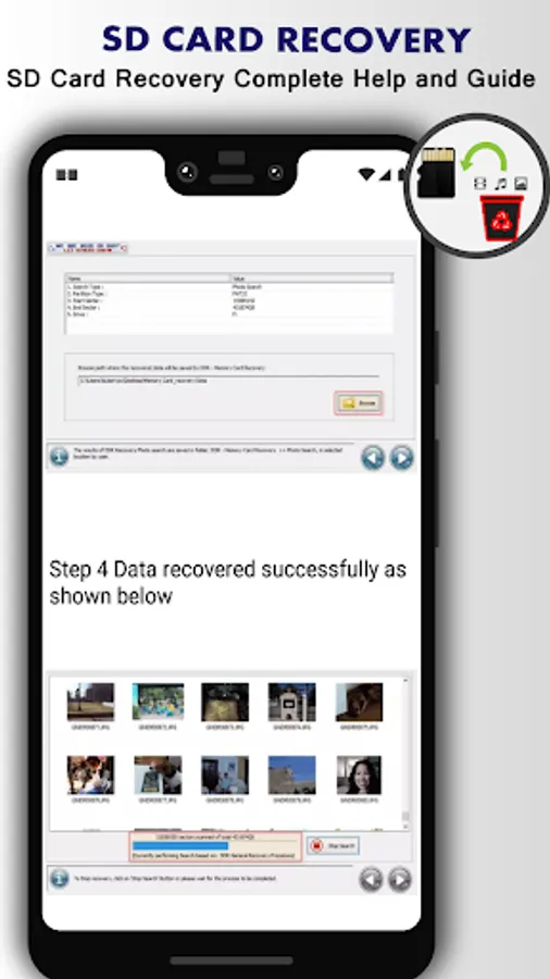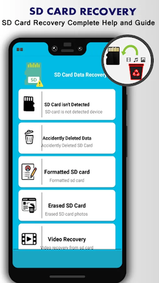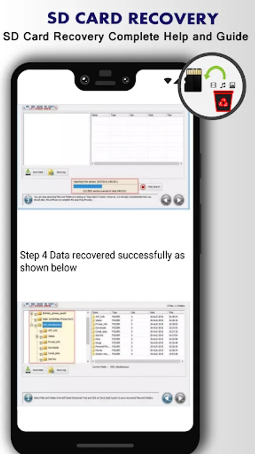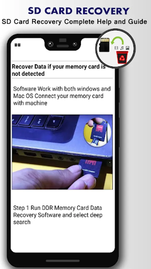 SD Card Data Recovery Guide application for all those user who deleted any type of data from phone and worried about to recover their data which is photos, videos, audio, docs any type which you want this application completely guide you step by step how you can get your deleted data in your phone can undelete and recover lost photos, documents, videos, music, guide completely and more from your memory card or internal memory see supported file types below. Whether you accidentally deleted a file, or even reformatted your memory card, SD Card Data Recovery powerful data recovery features can find your lost files and let you restore them. If you have deleted some videos or audios by mistake, and you want to recover the deleted videos and deleted audios. SD Card Data Recovery Guide the Data Recovery app guide will solve the problem for you will help you to recover deleted video, recover deleted photo, and recover deleted audio with this File recovery tool, you will recover and restore all your lost files in a little time.
