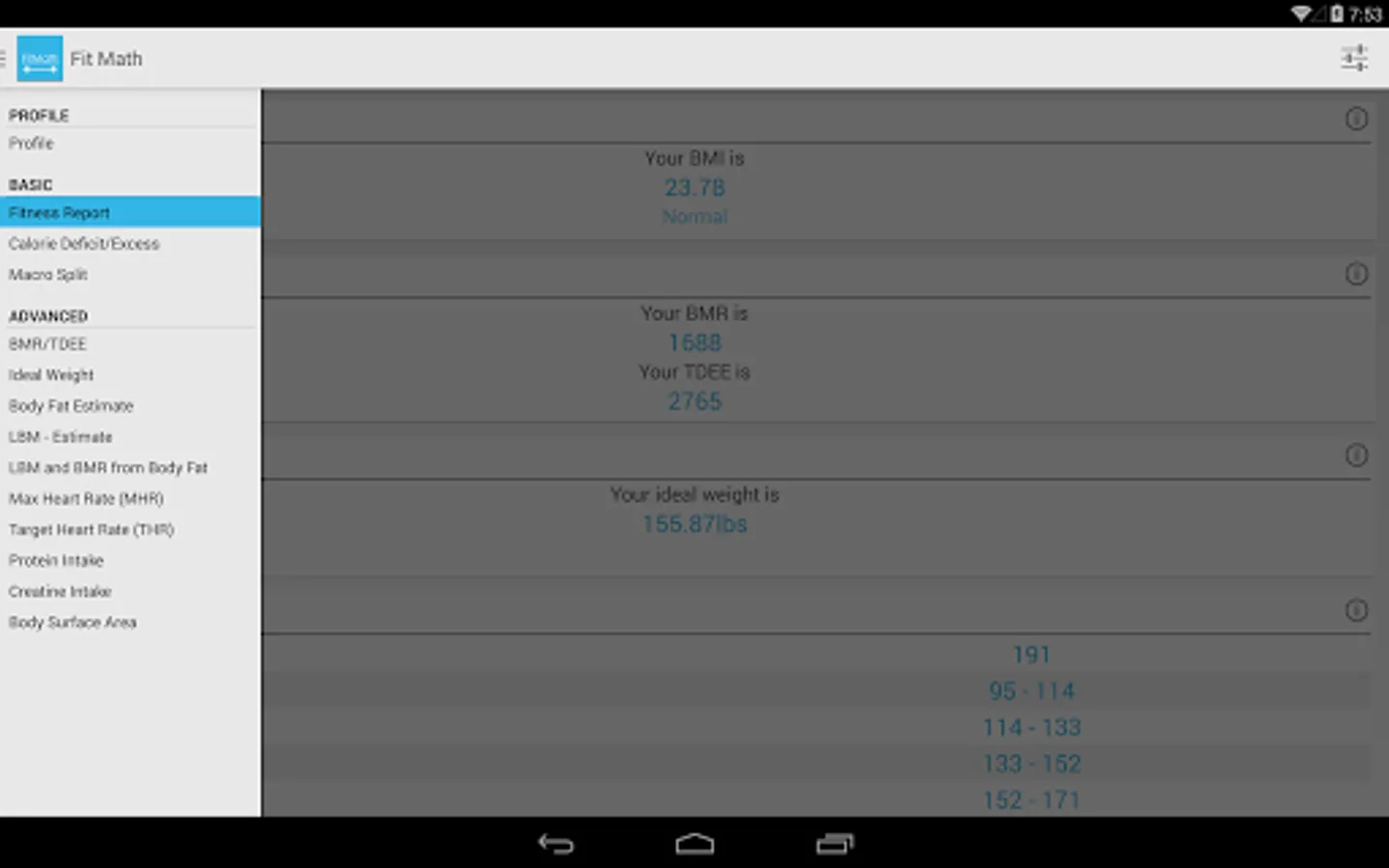 FitMath will cater to both the beginner trying to gather fitness data about themselves and the more advanced fitness enthusiast equally. It spans from basic calculators like BMI, ideal weight and heart rate to more advanced calculators for BMR, TDEE and body fat.