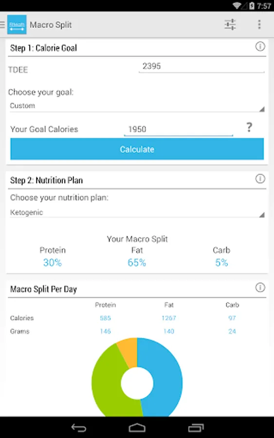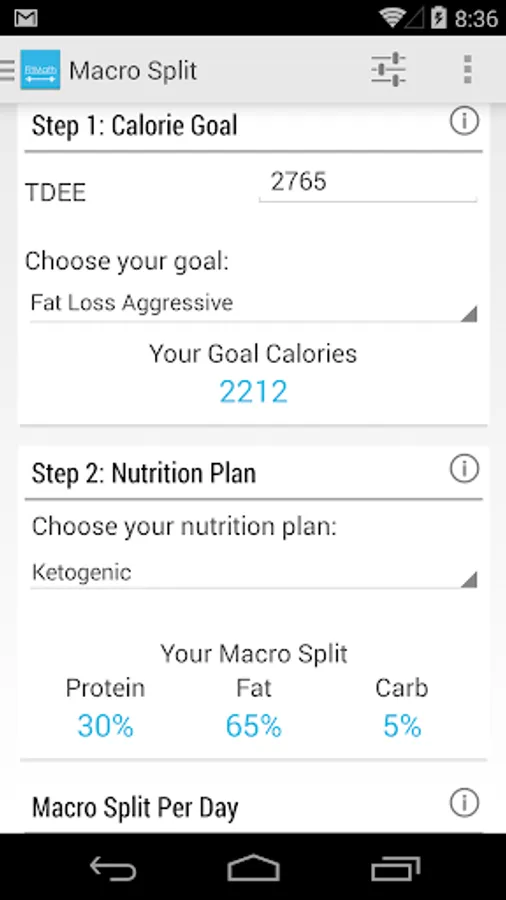 The TDEE (total daily energy expenditure) calculated is very accurate for your fitness level. The TDEE is also used as an input in the Macro Split calculator. The macro split calculator supports common fitness goals, custom goals, a deficit/excess calculator, common nutrition plans like keto, body builder, zone diet and even custom nutrition splits.