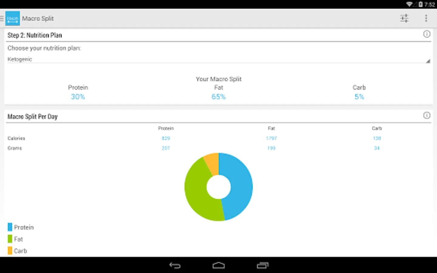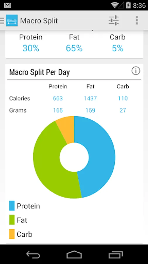 Macro nutrients split (protein, fats, carbs)