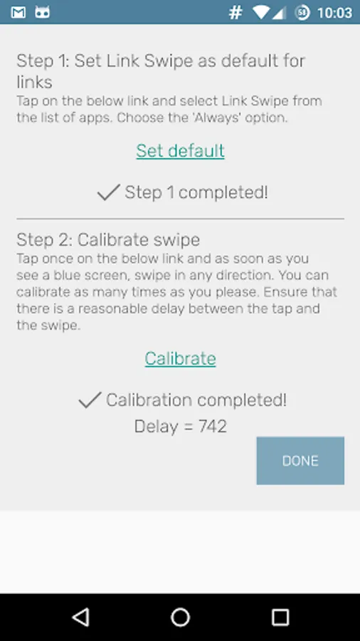 You can calibrate LinkSwipe using the calibration screen. Follow the instructions on this screen to calibrate the time for which LinkSwipe will wait for a swipe before going for the default action.
