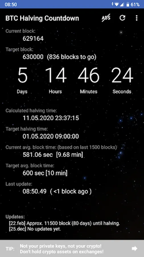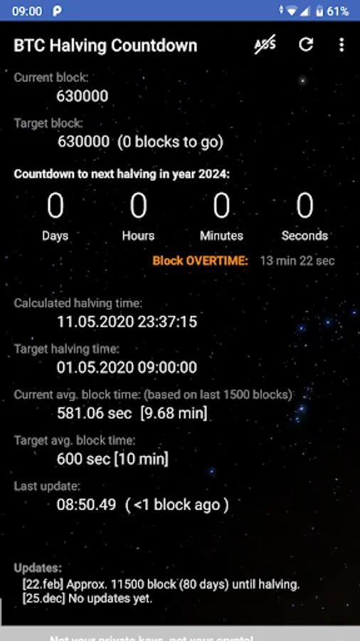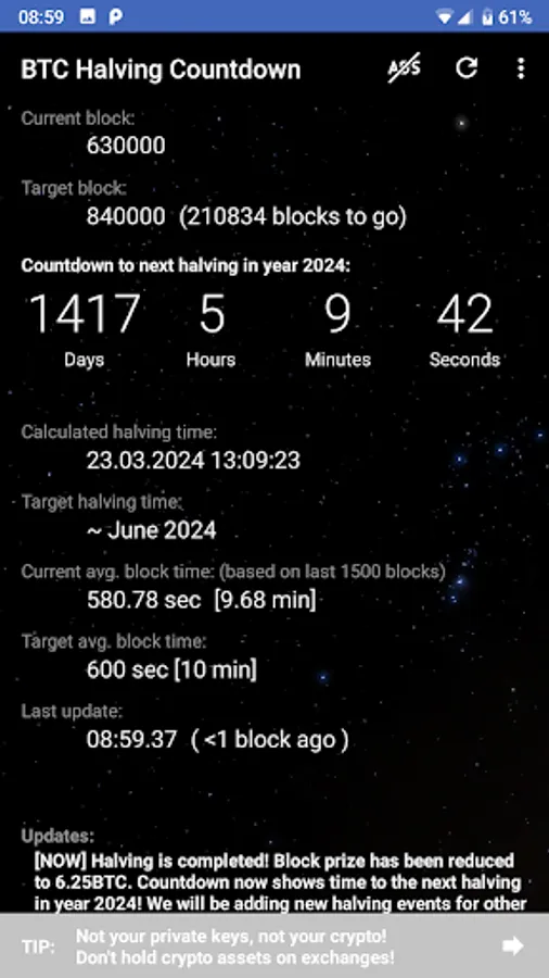 App calculates time when halving will happen depending on average speed / block time of last few hundred blocks. After halving event app will automatically start new countdown to next halving planned for some time in 2024 (block 840.000).