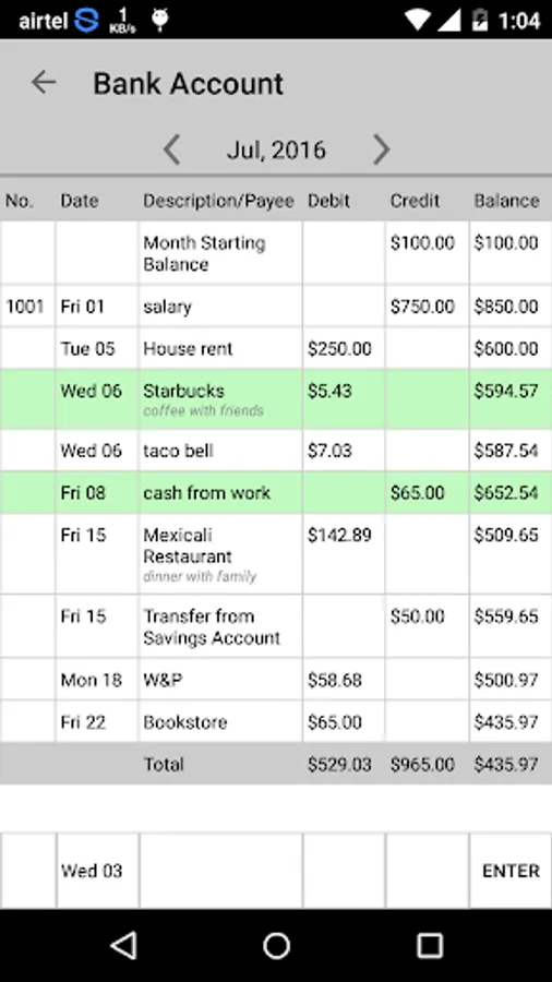# Clicking on a ledger row toggles highlighting the row in green . It is useful for marking which transactions have cleared.