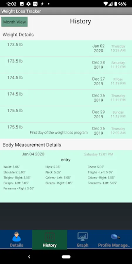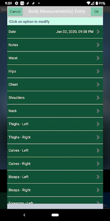 - Track various body measurements i.e. Waist, Hips, Chest, Shoulders, Neck, Thighs - Left, Thighs - Right, Calves - Left, Calves - Right, Biceps - Left, Biceps - Right, Forearms - Left, Forearms - Right