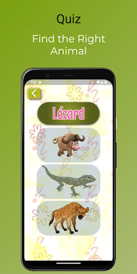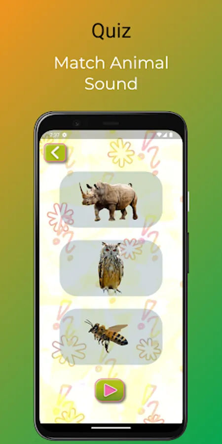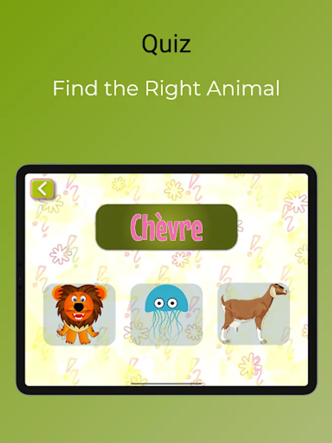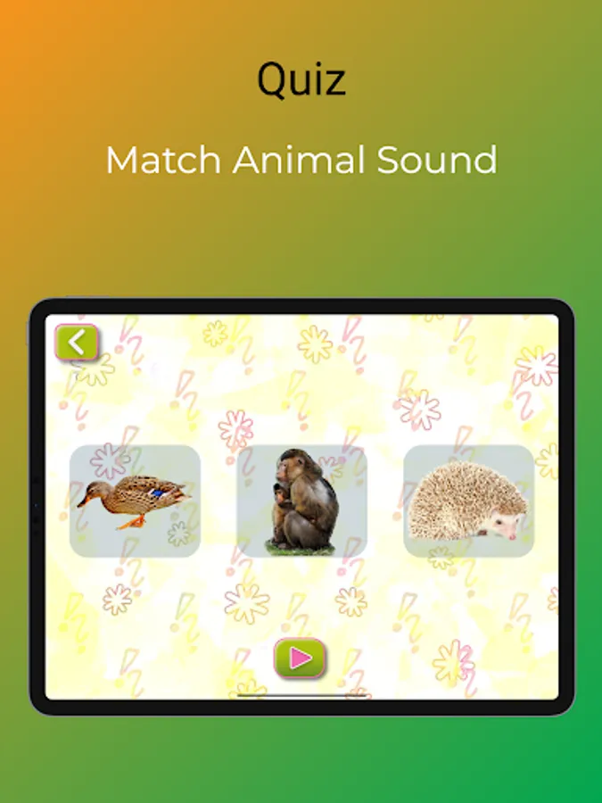 Quizzes: The app also includes quizzes that test kids' knowledge of animals. Kids can answer questions about animal names, sounds, and pictures.