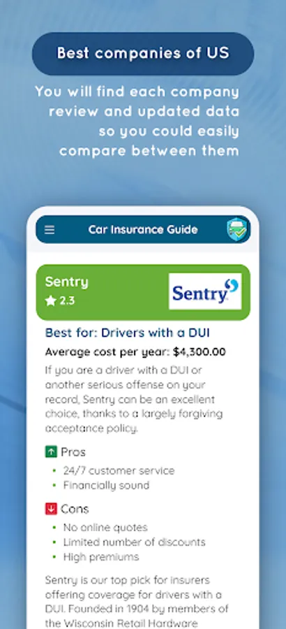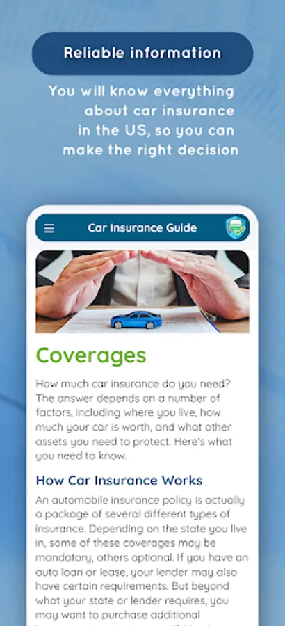 Car Insurance App is an app that helps you determine the best car insurance for your car. You will be able to compare different car insurance companies and view their policies and features. Also you will learn about the different types of car insurance in US, so you will choose the best decision for you.