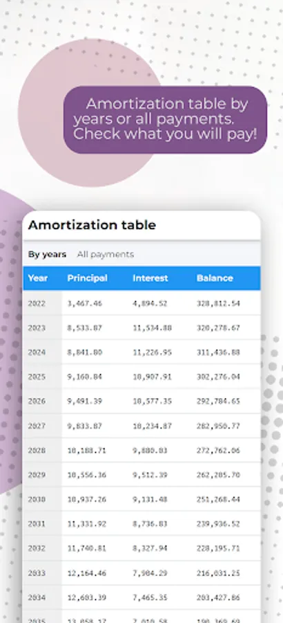 - Amortization tables by years or all payments, showing principal paid, interest, remaining balance and LTV