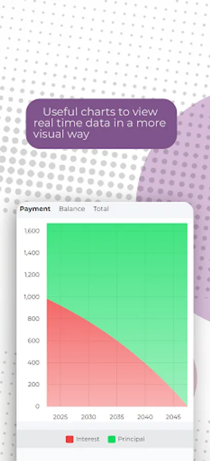 - Amazing graphs such as detailed payment made over the life of the mortgage, balance at each point in time and total breakdown of interest and principal paid