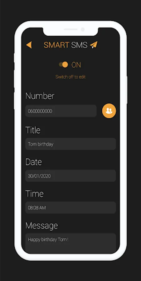 Smart SMS allows you to write your SMS, select a recipient and set the date and time you want to send it.