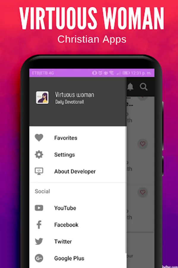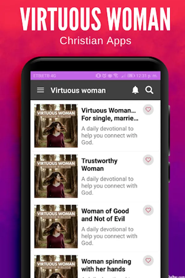 Virtuous Woman - Devotional app, esta diseñada para que conozcas la manera de acercarte mas a Dios. Una mujer virtuosa es una mujer bendecida que vive de acuerdo con los principios de Dios y conforme a su voluntad