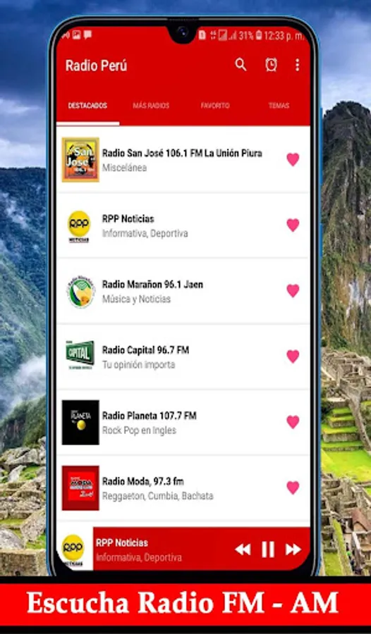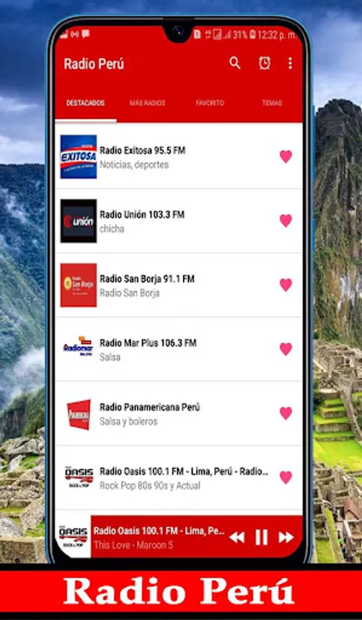 Radio Peru AM FM live is a totally free app, which allows you to listen to the best, Salsa Rock, Bachata, Huaynos music from all Peru departments live, now enjoy the new trend when listening to Peruvian radios am fm in Spanish.