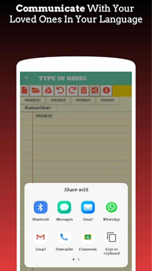 a.) Type the text and after you get the full text in Hindi, press Share button. Then press the Clipboard button.