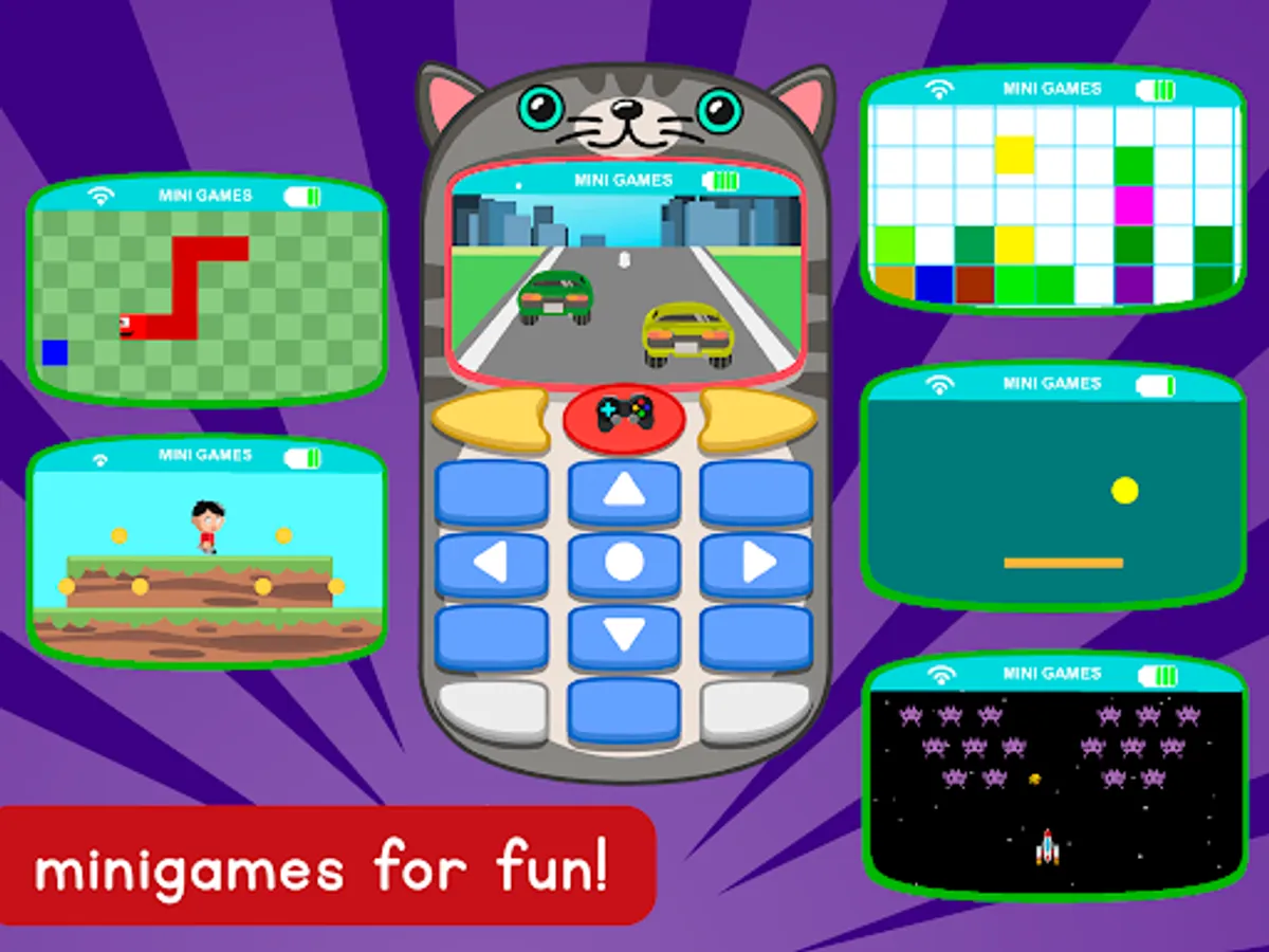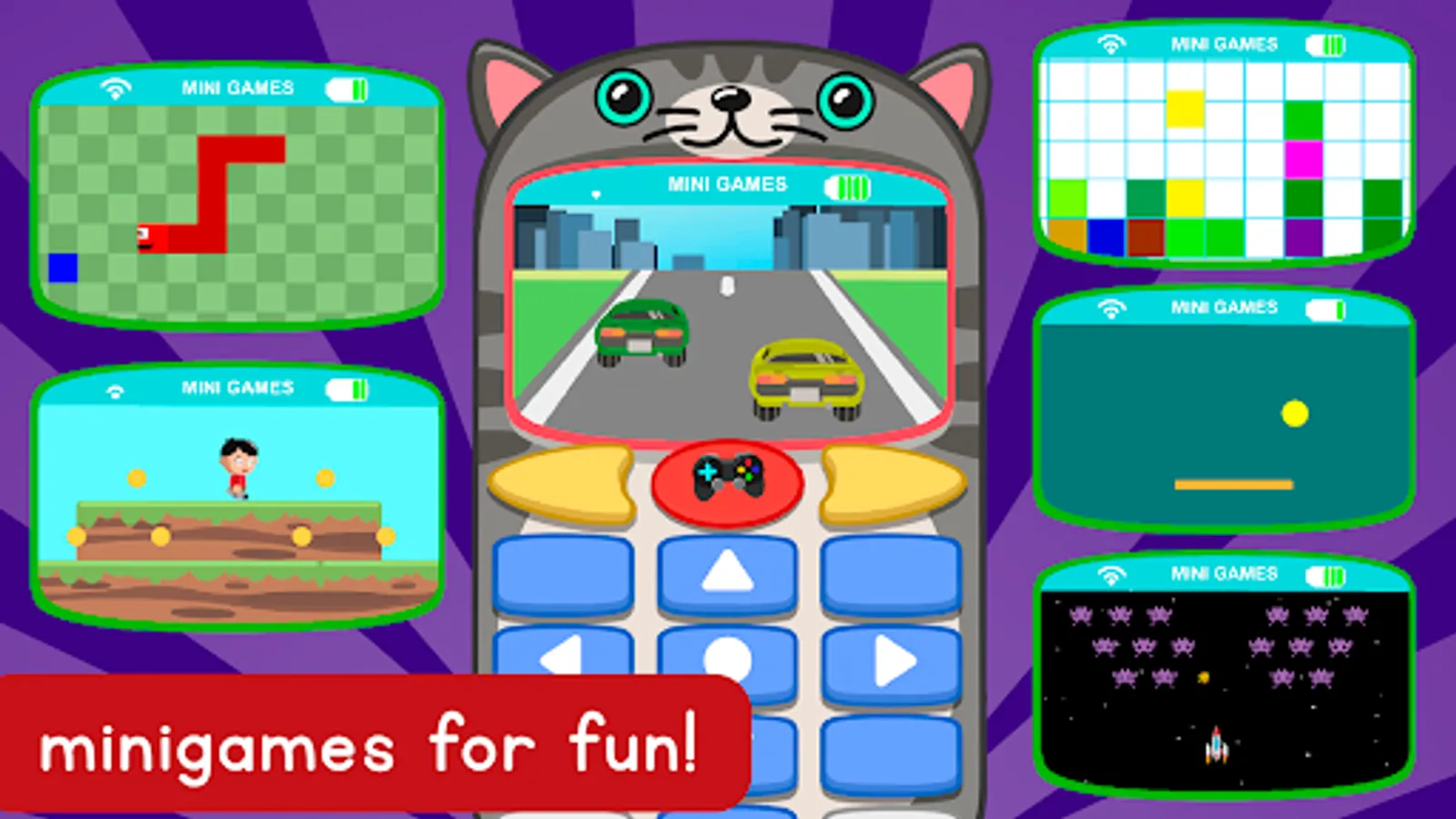 - 10 easy level mini-games for the little ones to enjoy (running game, emoji messages, snake game, building blocks, pick up coins, spaceship and many other games).