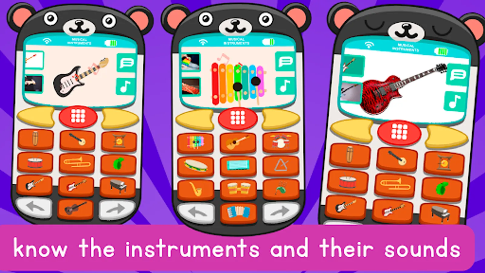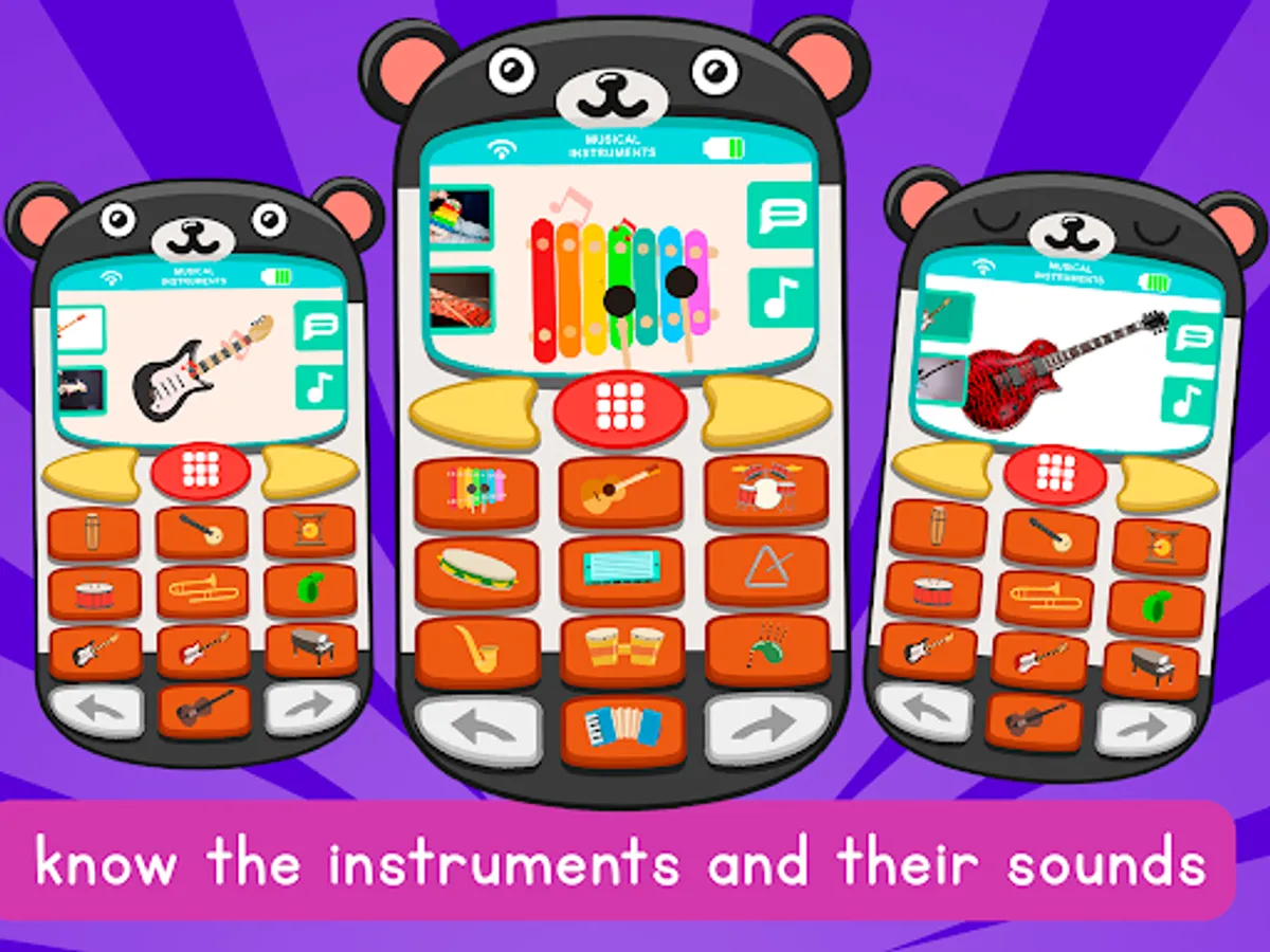 - Musical instruments with illustration, photo and the sound of the instrument (xylophone, guitar, drums, accordion, harmonica and several other instruments).