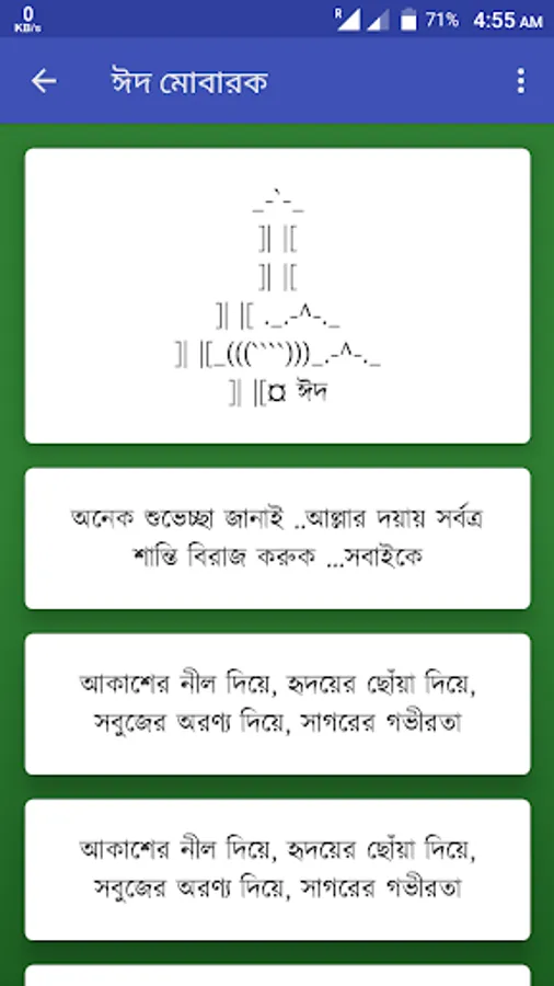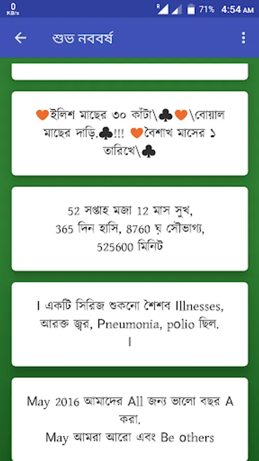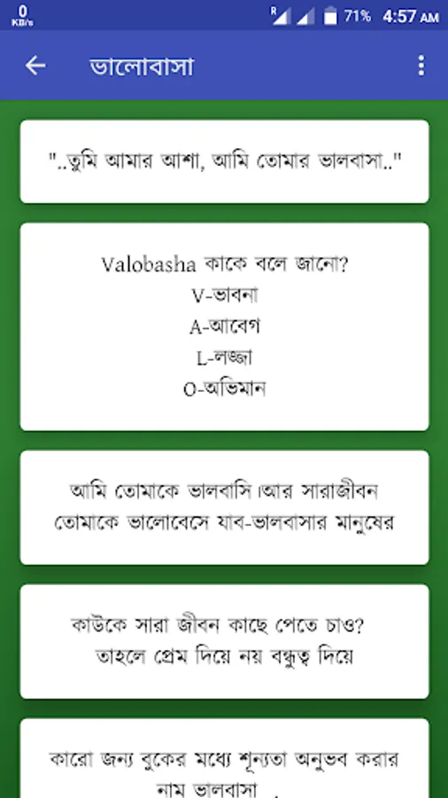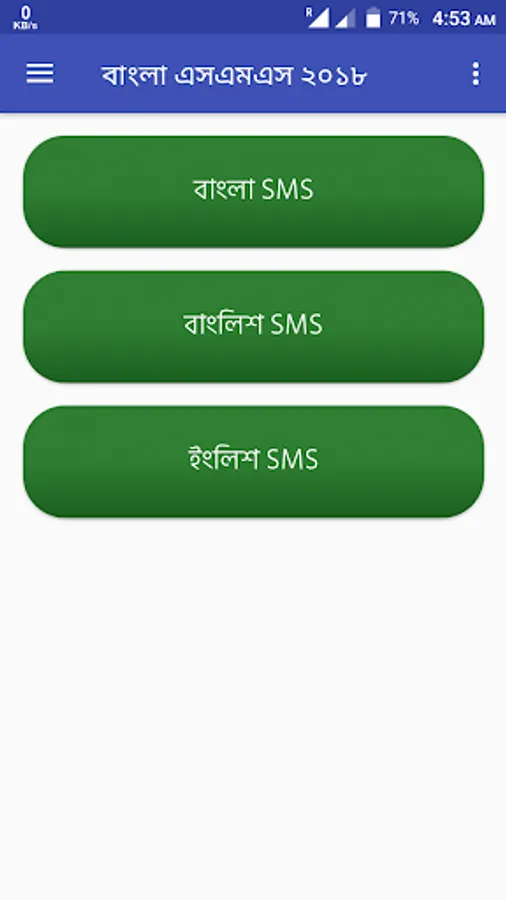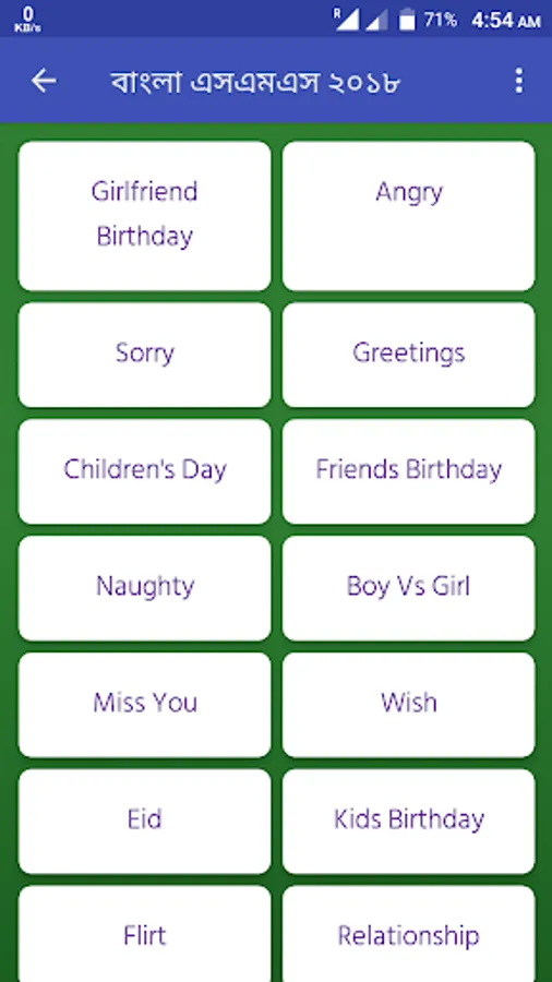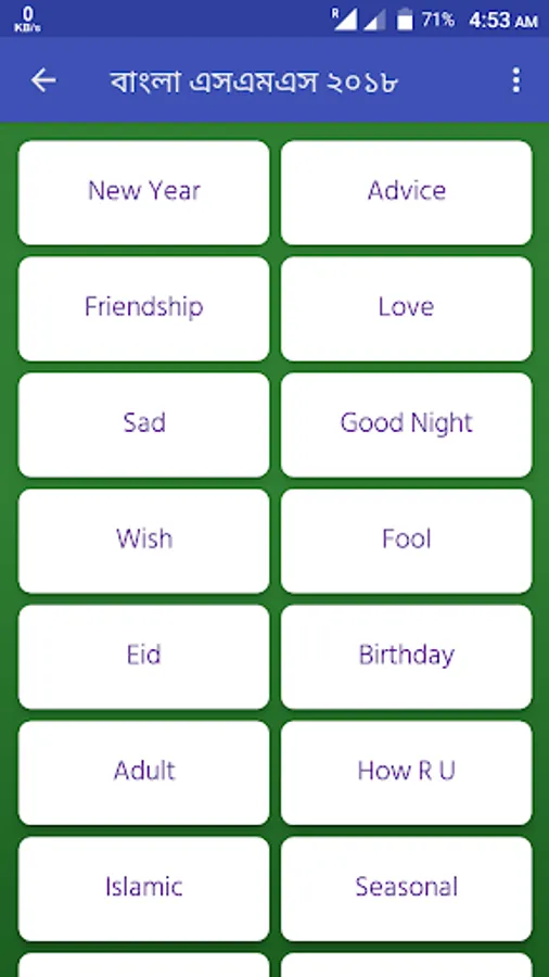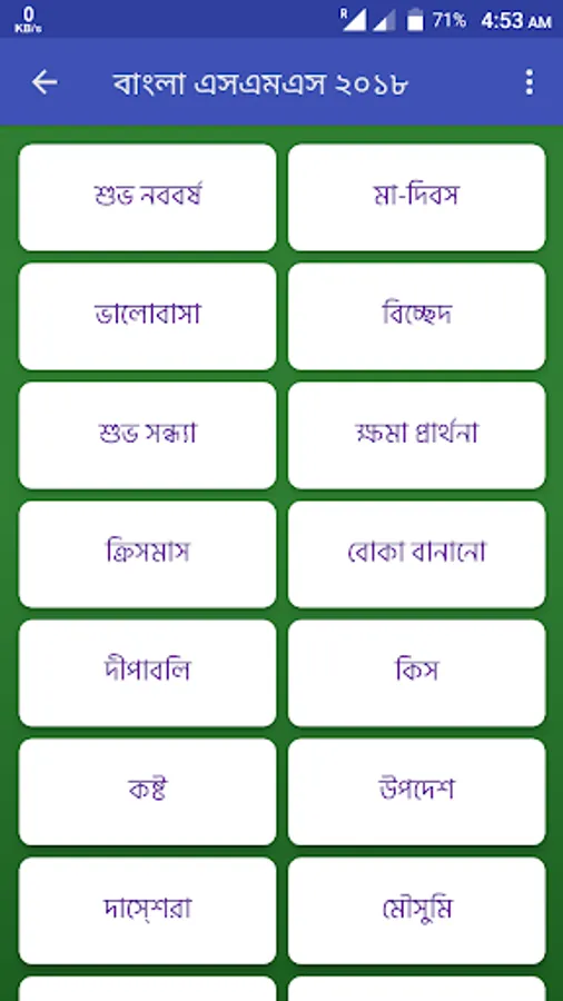 The app has a huge collection of Bangla SMS. Different categories of messages have been given in the app. SMS of love, suffering SMS of many more categories.